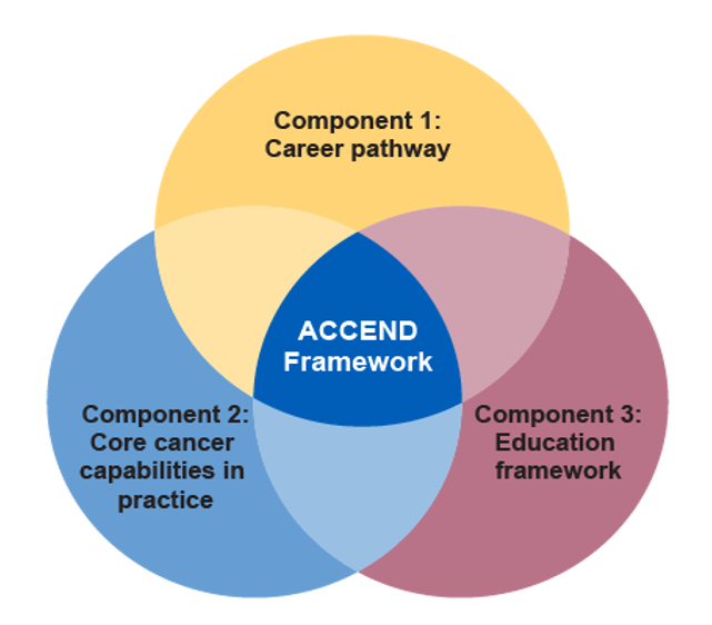 ACCEND stands for Aspirant Cancer Career Education and Development. It provides a national framework outlining the skills, knowledge, and capabilities healthcare professionals need to provide high-quality care to people affected by cancer. It serves as a life-long career pathway for nurses, allied health professionals and support workers that will help design and standardise career development and training opportunities.