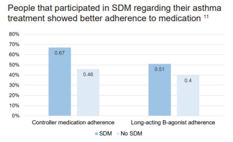 • Our evidence-based infographic provides a quick overview of the importance and benefits of SDM. For example, the graph below demonstrates that people who participated in SDM regarding their asthma treatment showed better adherence to medication.