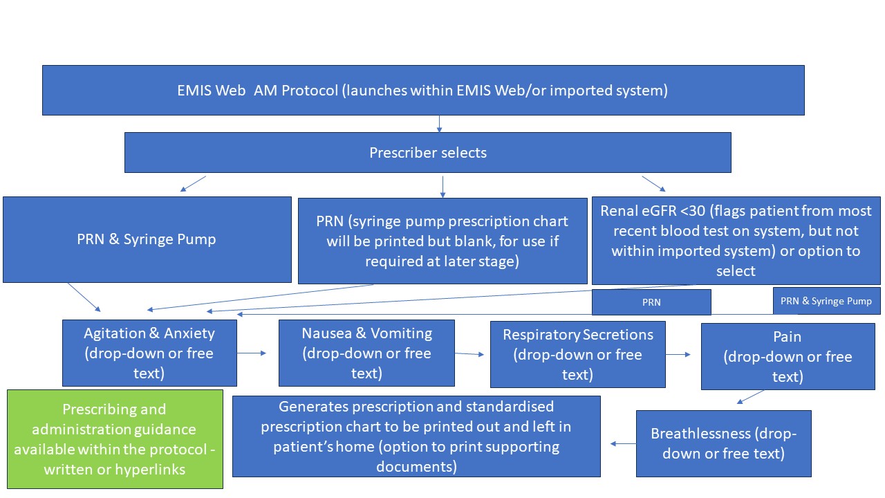 Generalist and specialist palliative clinicians have collaborated to create an EMIS prescribing protocol and supporting documents, which are designed to improve symptom control for patients who are at End-of-Life, to enable more timely administration, more equitable access and to reduce prescribing and administration errors.